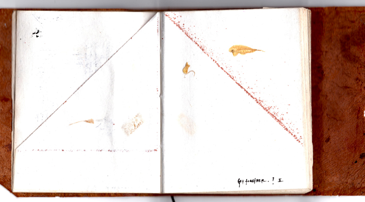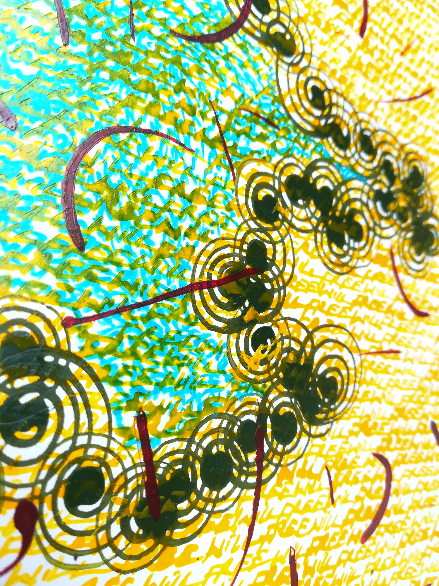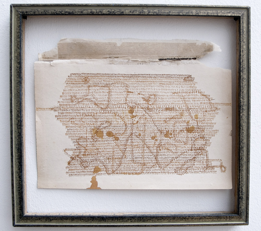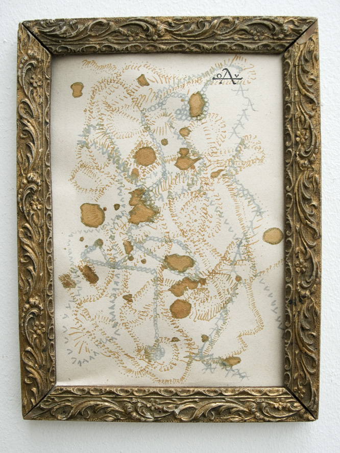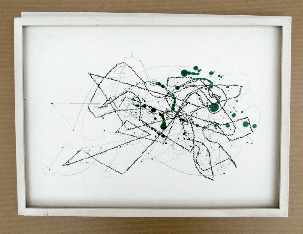 Bleistift, Tinte und Tusche auf Papier. Schräger goldener Plastikrahmen über schrägem Blatt. ca 20 x 30 cm