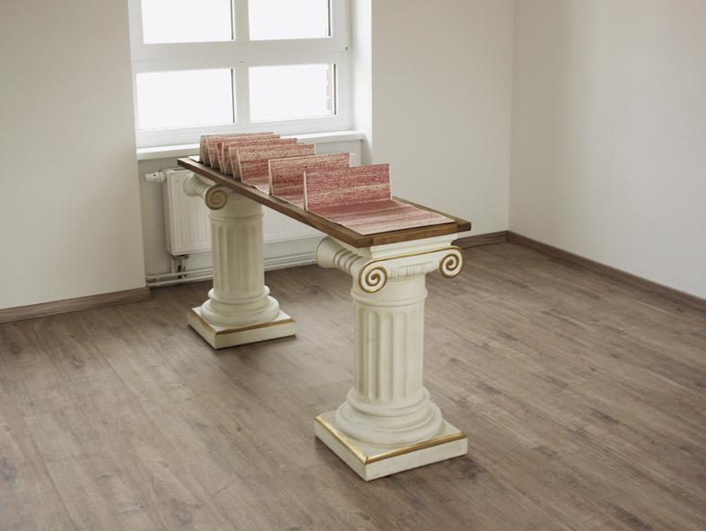 Platon. Phaidon. 2011, Kant. Zum ewigen Frieden. 2010, Hölderlin, Hyperion. 2012, Bücher, Graureiherfeder, diverse Holzkisten.