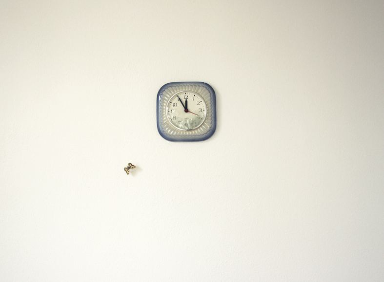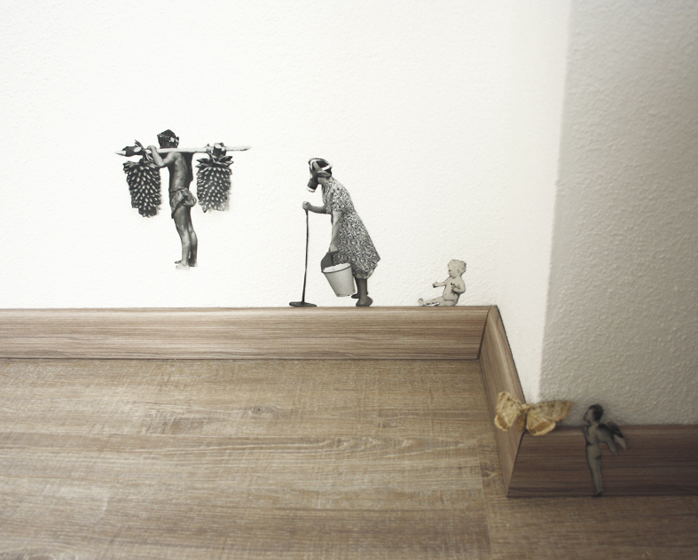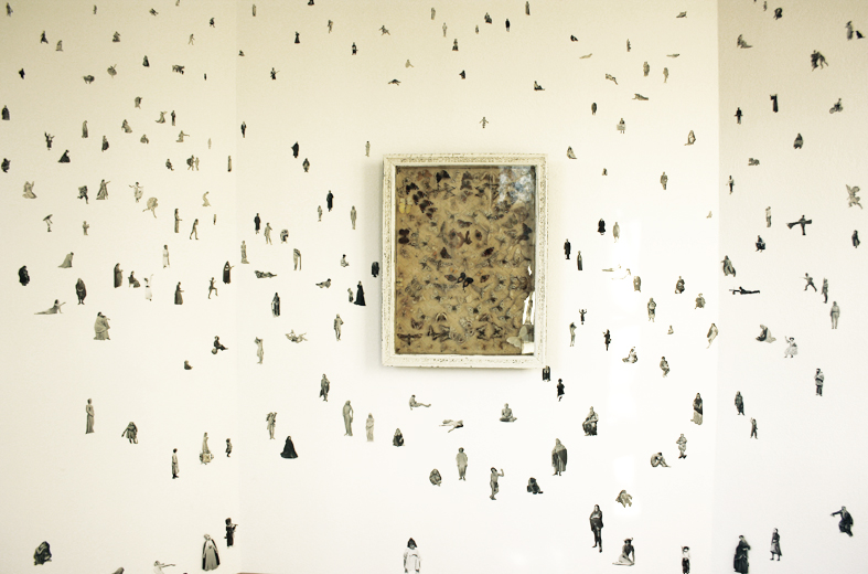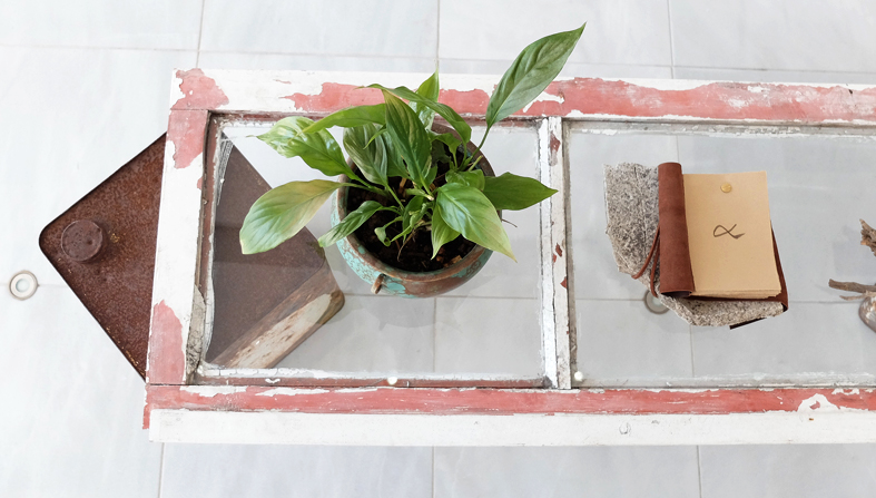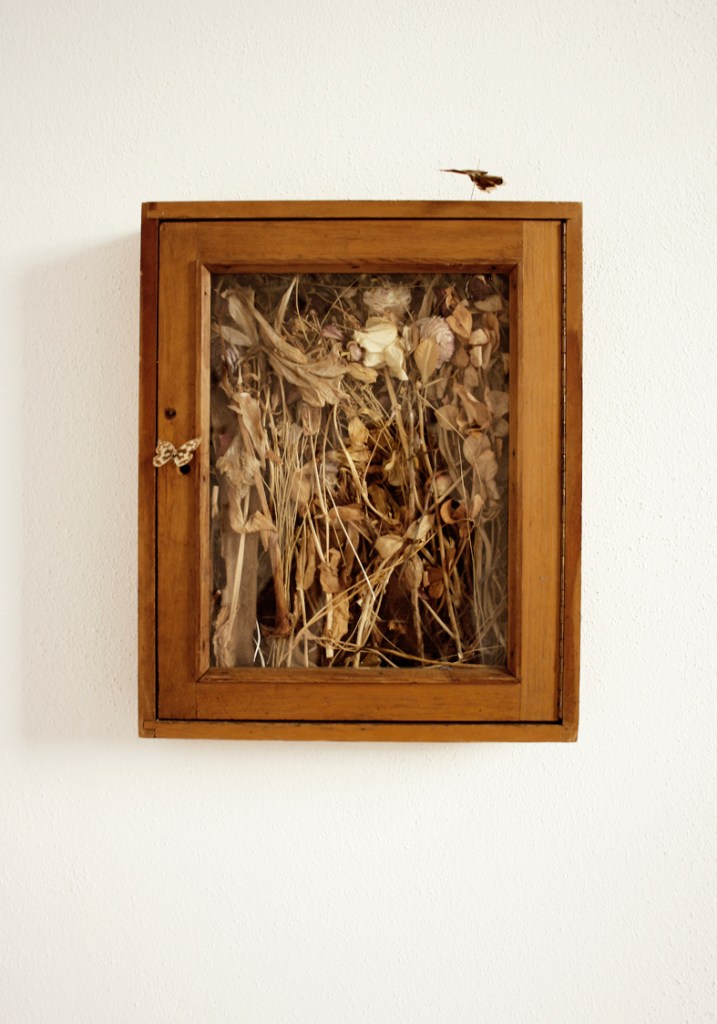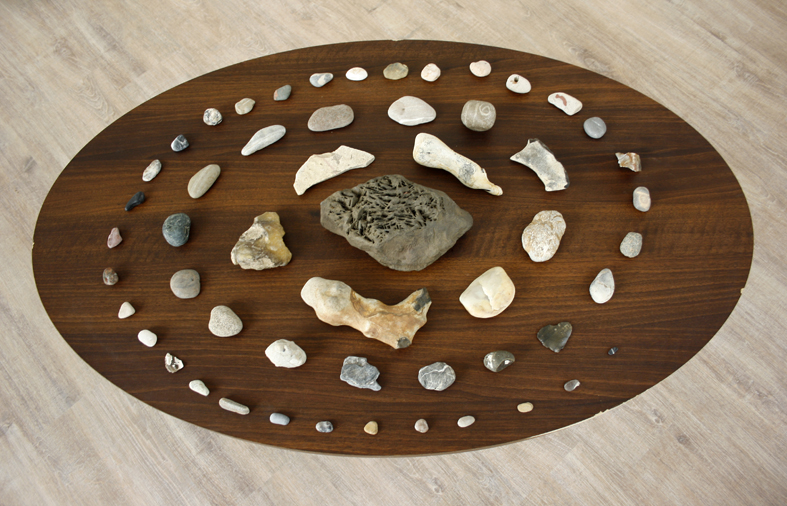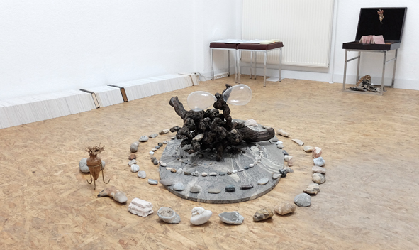 Zerstörte Alt-System-Uhr, die weiter auf der Stelle tickt. Papierfigurenkollage auf Wand. Schmetterlingskasten und tote Schmetterlinge. Gitarre und Kalimba zum Musik machen. Offene Tagebücher in Dosen. Tage des Zweifels. Tage des Zorns auf Samtrahmen und Alt-Sytem-Truhe. Versteinerter Indischer Regenwald. MAGNUM Sonderausgabe mit Foto eines längst geschmolzenen Eisbergs. Kreisversammlung der Staatenlosen Steine. Stein wie Wasser (Marmorplatte) mit flugunfähigem Schmetterling.