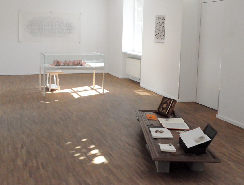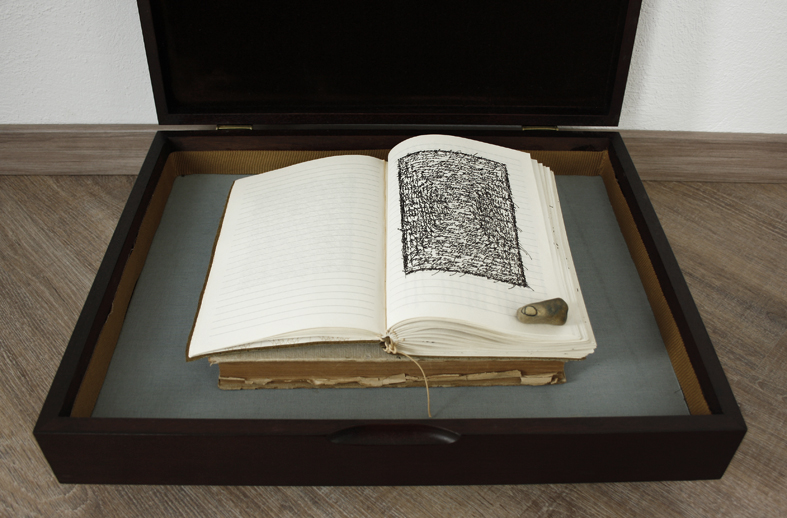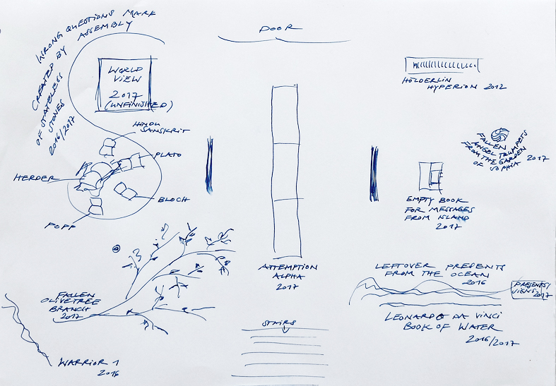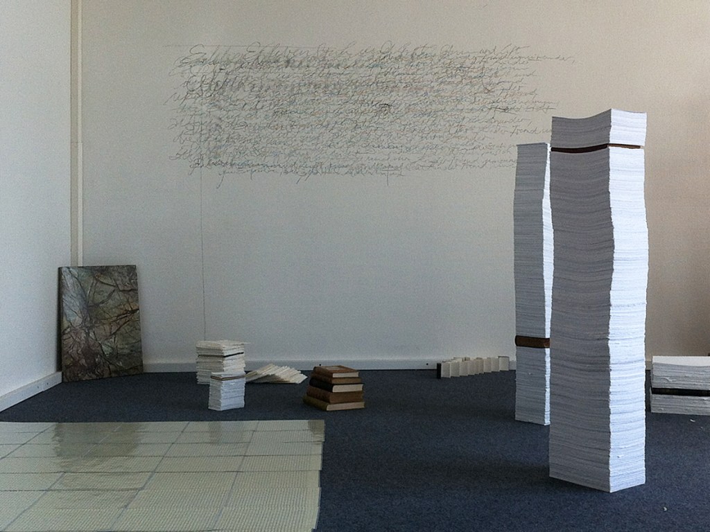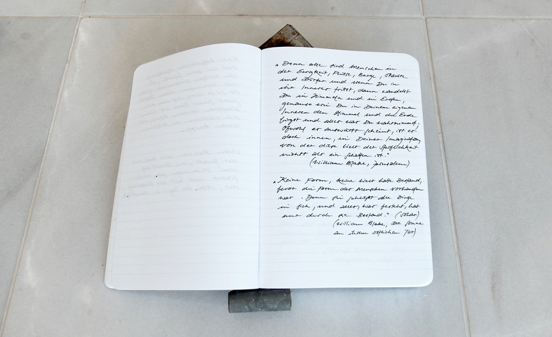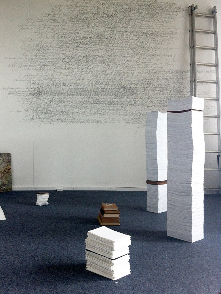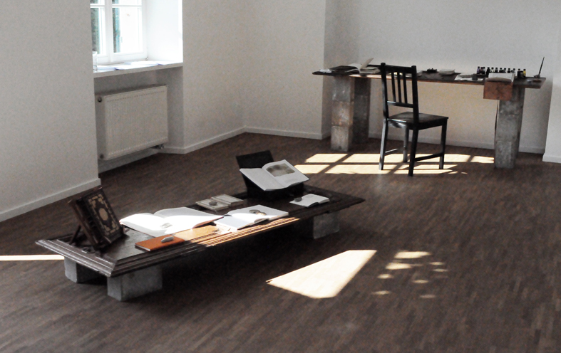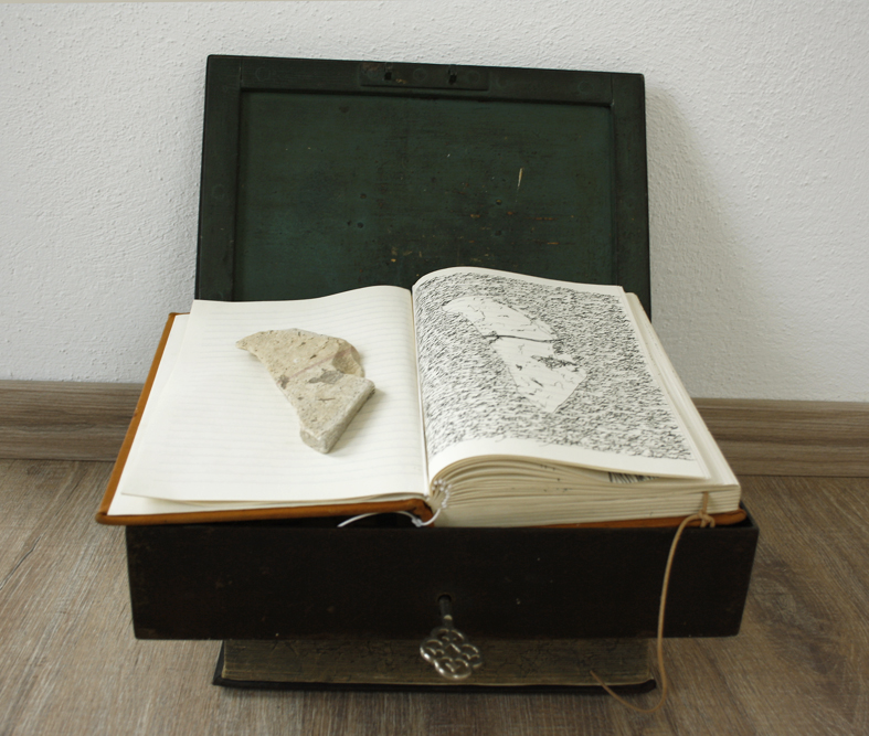 Fundbausteine und Alte Türen. Stuhl. Kafkas Tagebücher (gedruckt und handgeschrieben). Diverse Tinten und Staatenlose Steine. Federhalter und-halter. Offene und gefesselte Tagebücher. Unfinished Book for Peace. Briefe an das Meer. Marc Aurel in DDR und BRD-Ausgabe. Byung-Chul Han (Die Errettung des Schönen). Steffen Popp (Dickicht mit reden und Augen) und die blaue Blume (mit Gedicht von Novalis). Leonardo da Vinci (Das Wasserbuch). Tage des Zweifels/ Tage des Zorns. (Gezeichnetes Buch). Dimension variabel.