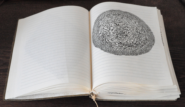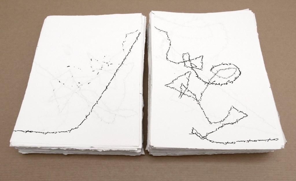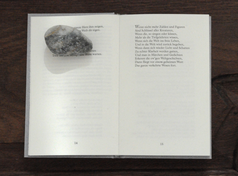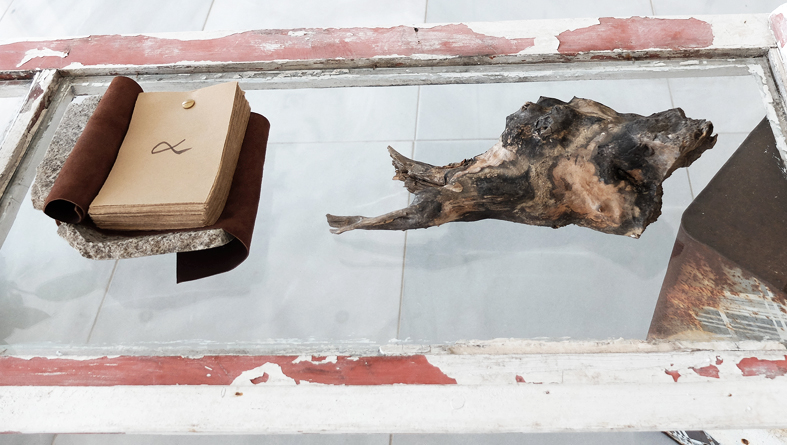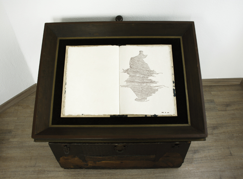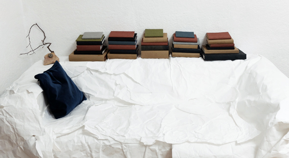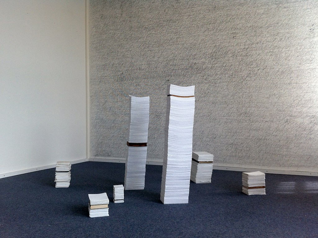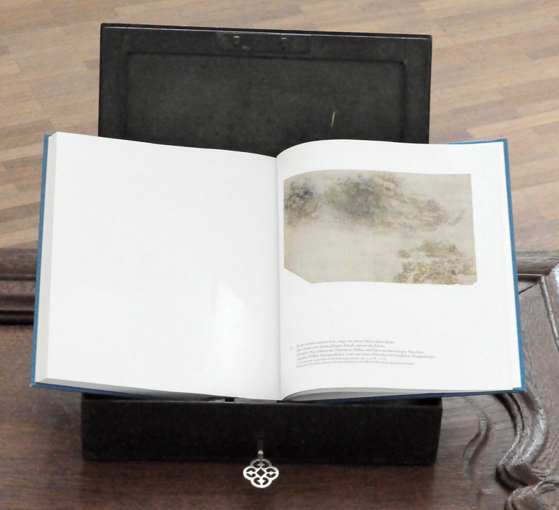 Fundbausteine und Alte Türen. Stuhl. Kafkas Tagebücher (gedruckt und handgeschrieben). Diverse Tinten und Staatenlose Steine. Federhalter und-halter. Offene und gefesselte Tagebücher. Unfinished Book for Peace. Briefe an das Meer. Marc Aurel in DDR und BRD-Ausgabe. Byung-Chul Han (Die Errettung des Schönen). Steffen Popp (Dickicht mit reden und Augen) und die blaue Blume (mit Gedicht von Novalis). Leonardo da Vinci (Das Wasserbuch). Tage des Zweifels/ Tage des Zorns. (Gezeichnetes Buch). Dimension variabel.