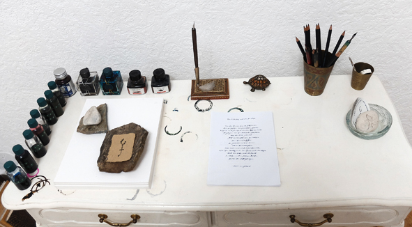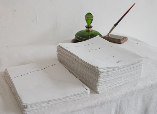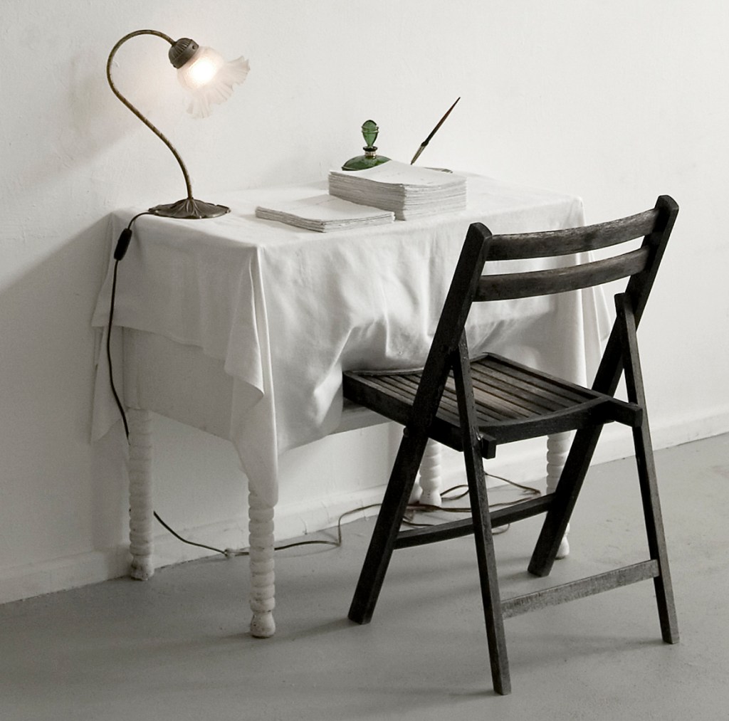 Kleiner Tisch. Handgerissenes Papier. Füllfeder mit-halter. Tintenfass. Innere und äussere Ruhe.