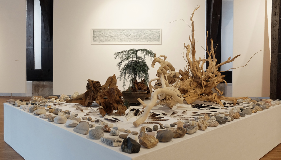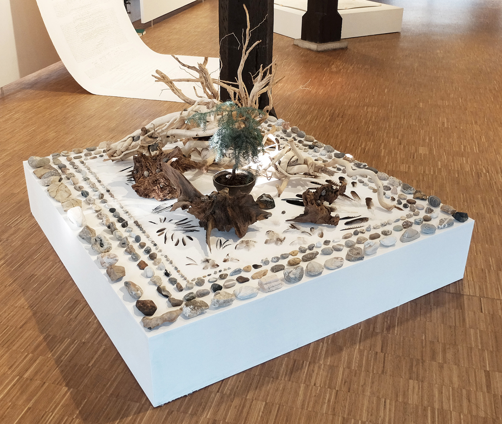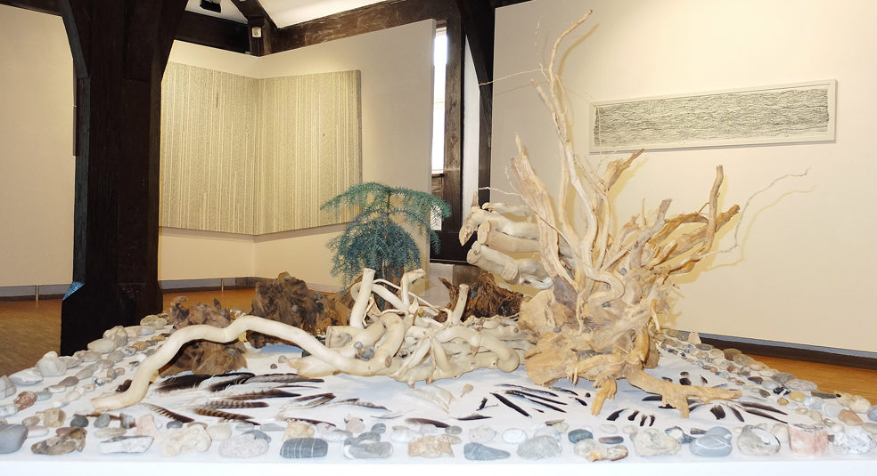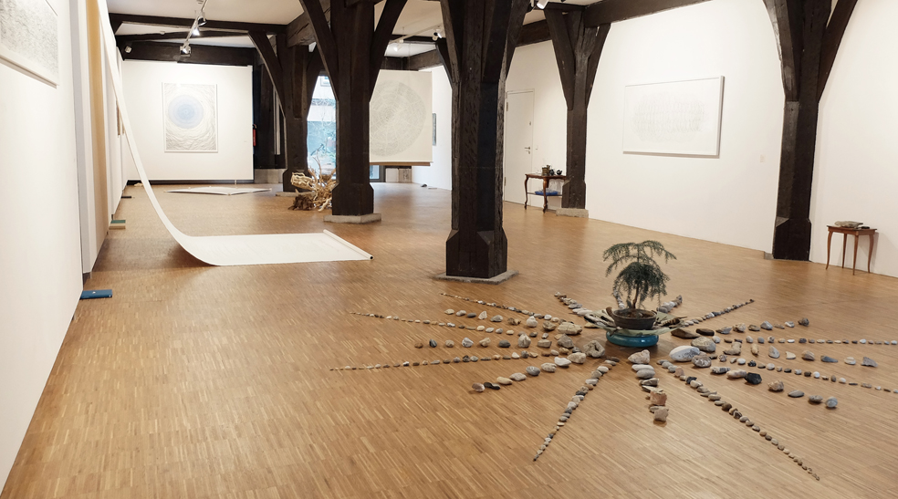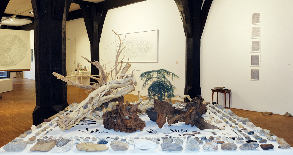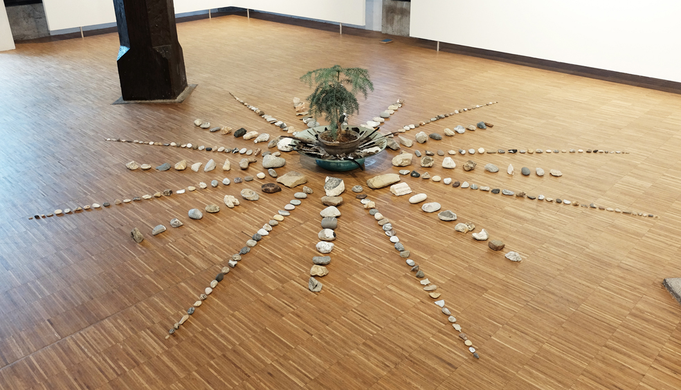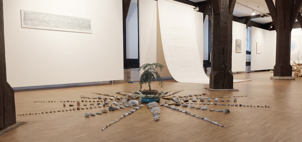 Installationsansichten der Einzelausstellung Speicher-Wurzel-Basis-Arbeit in der Galerie im Kornhaus des Gmünder Kunstvereins