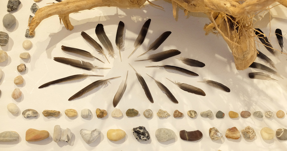 Zimmertanne, 3 Eichenwurzeln , 2 Efeuwurzeln, 1 Eibischwurzel, Staatenlose Steine, Abgeworfene Vogelfedern, Befreite Fossilschnecken.