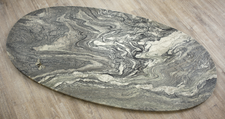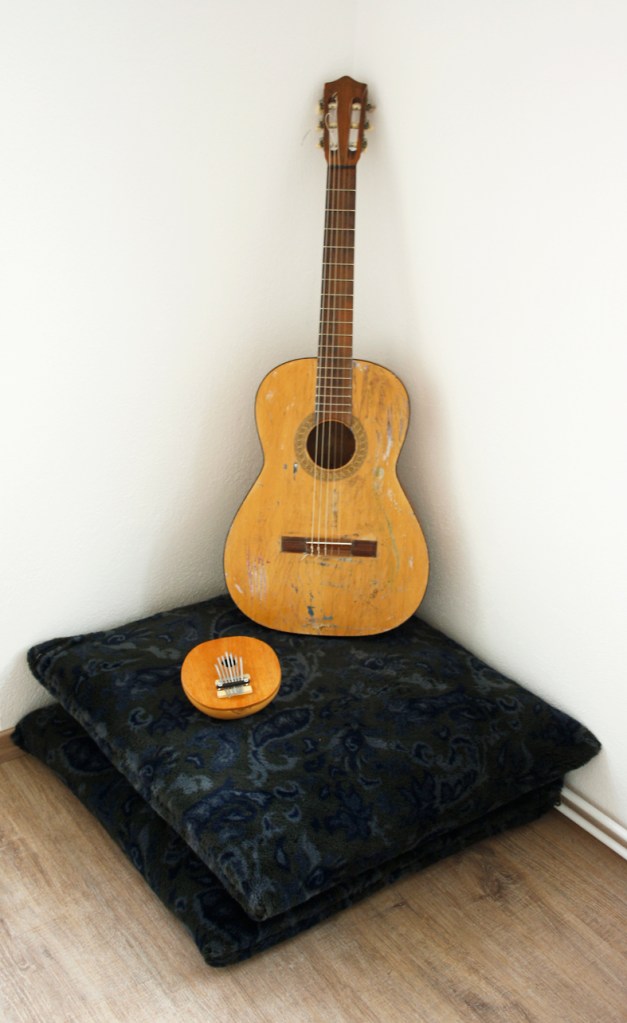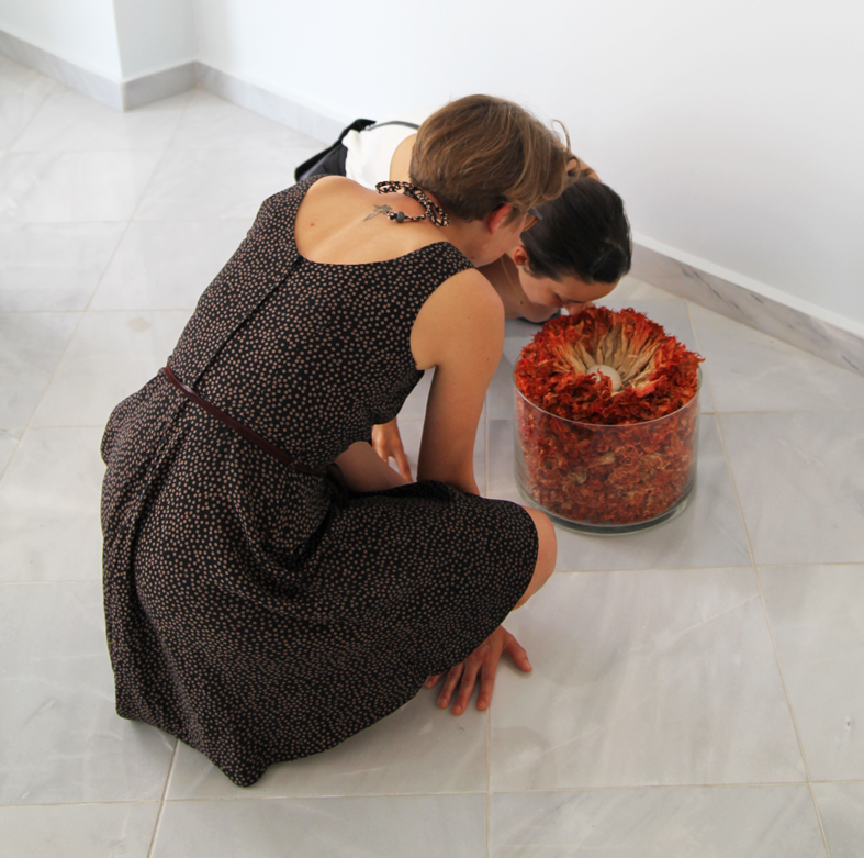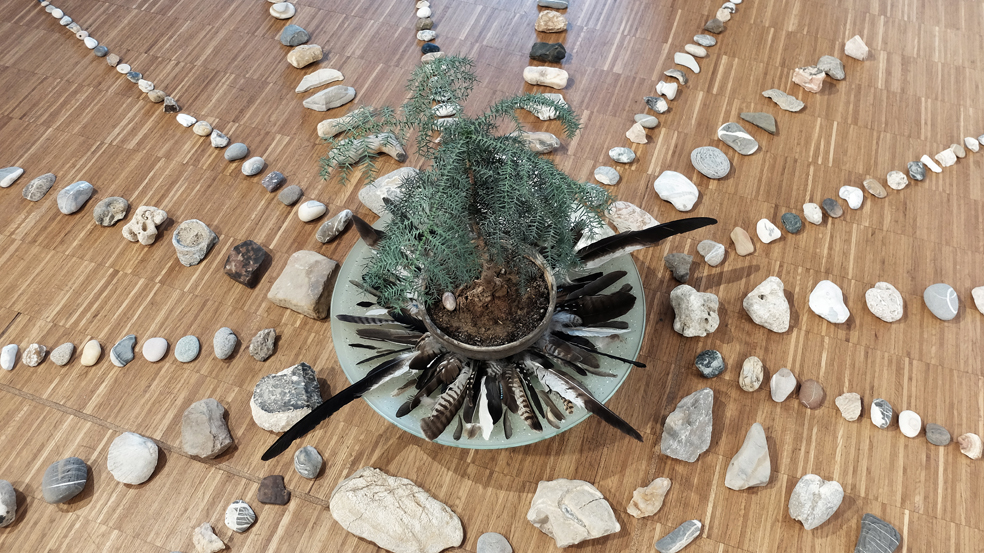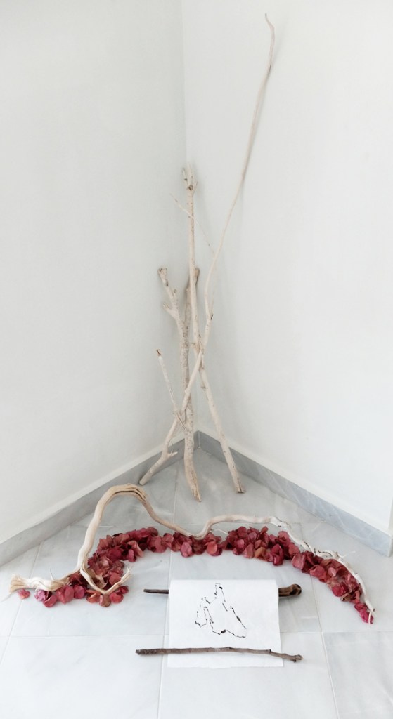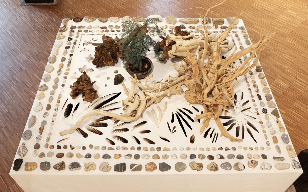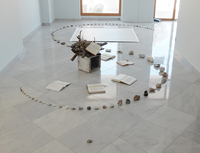 Marmorplatte (Stein wie Wasser). 3 Wurzeln. Wasserwirbler. Staatenlose Steine. Kefalonisches Keramikgefäß mit Bambuswurzel. Handgerissenes Papier. Bücher. Hocker mit APO-Block- und Informatio. Hyperion im Reisekiste mit getrocknetem Blmenstrauss. In Papier verpacktes Sofa und zum Blinsauswählen verpackte weise Bücher, 2 Steine und 1 Ast (Gaia-Moon -Reflektor-System). Arbeitstisch. Beistelltisch mit Zimmertanne und Wasserwirbelutensilien. Kalimba zum Klangspielen.