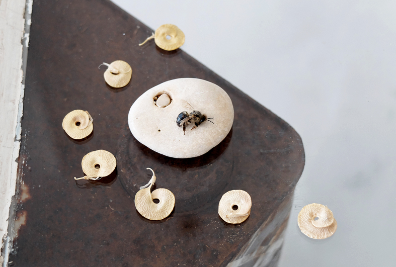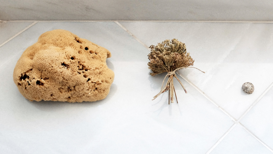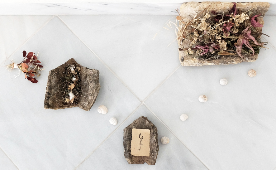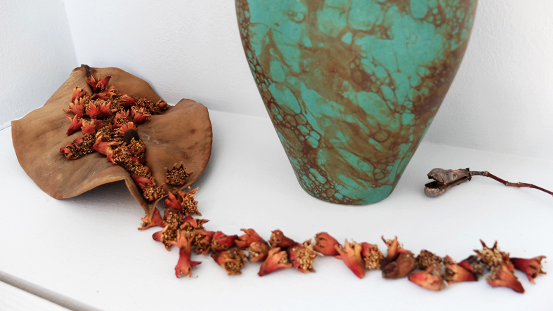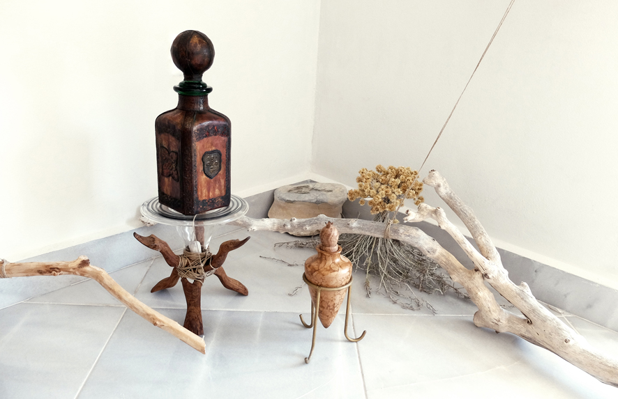 Einblatt in kefalonischer Vase. Ziegel, Handgebundenes Lederbuch. Wurzelstück. Samen. SteinInStein. Tote Biene. Jahrhundertealtes unverändertes Saatgut. Kaktusinneres. Glasfläschchen mit Waser aus dem Ionischen Meer. Tonstück (vermutlich von einer Vase). Papier. Sonnegelbe getrocknete Engelstrompete. Versteinerstes Muschelstück. Kleiner Krug. 2 beschriftete Wassergläser Dachziegel. Trocknende Heilkräuter. Kefalonische Karaffe. Im Hintergrund: Das Wasserbuch von Leonardo da Vinci über Schwemmholz.
