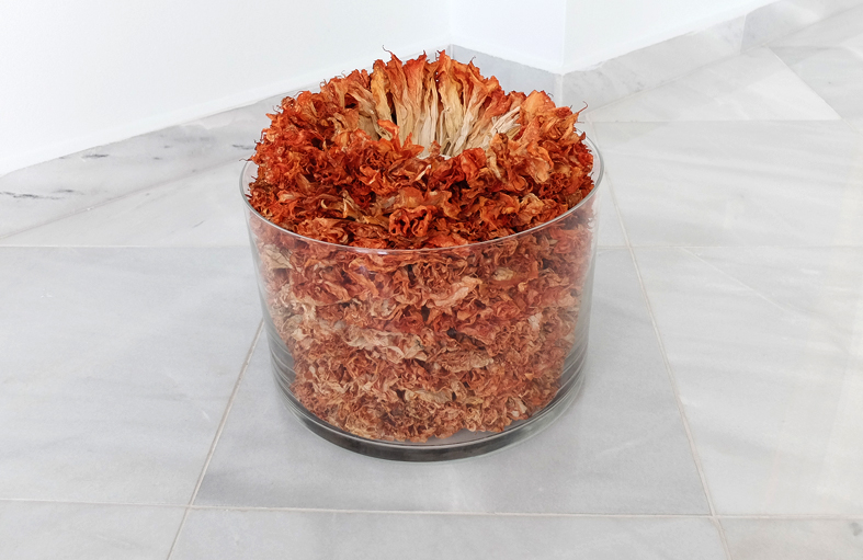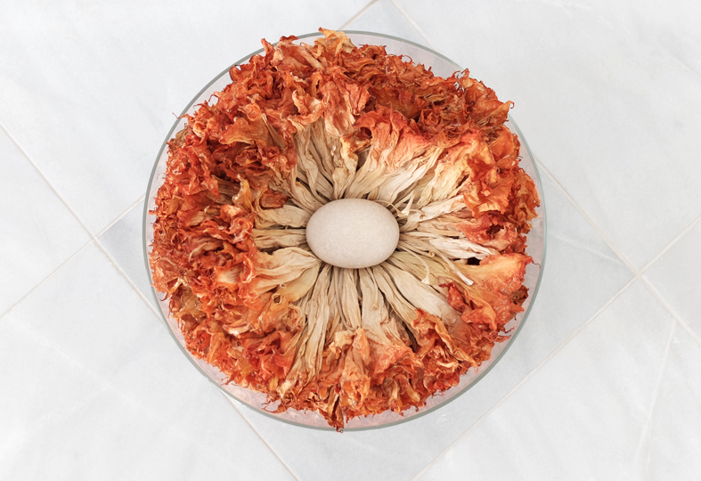 Glasschale. Gefallene und getrocknete Engelstrompeten. Geruch.