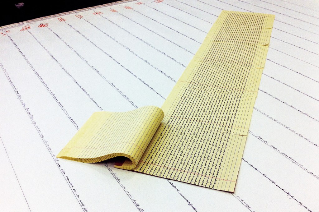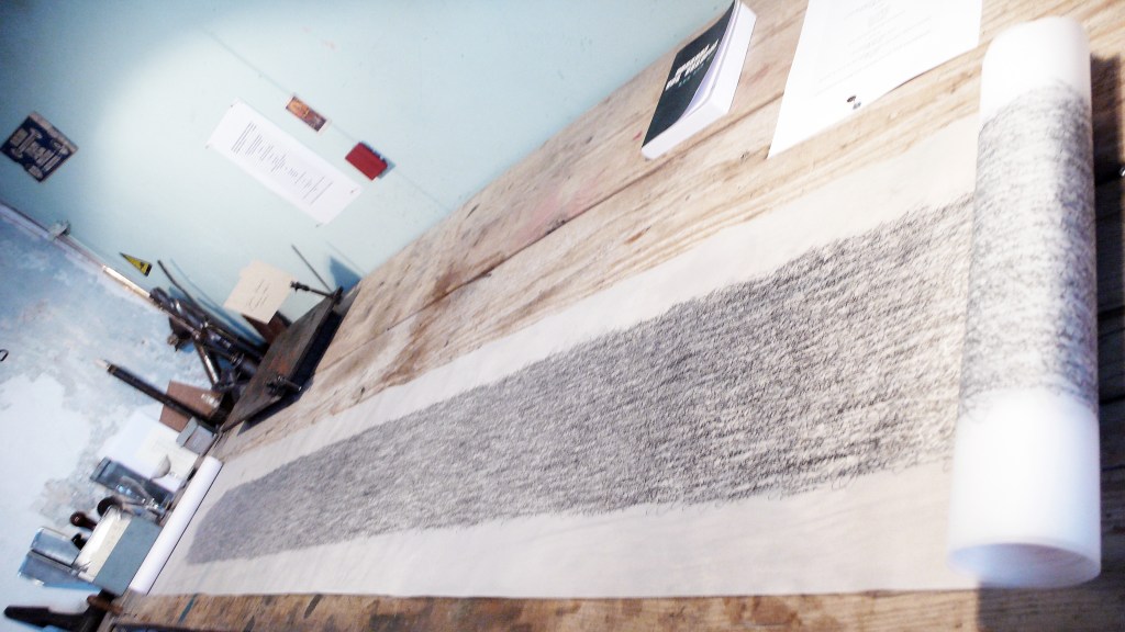 Rollerpen auf Pergamentpapierrolle. Filz. Papierrolle. Text zu Mensch, Massentierhaltung und Umwelt. 1 Wort (Schwein). Zeit und Dimension variabel.