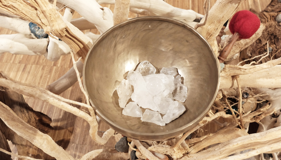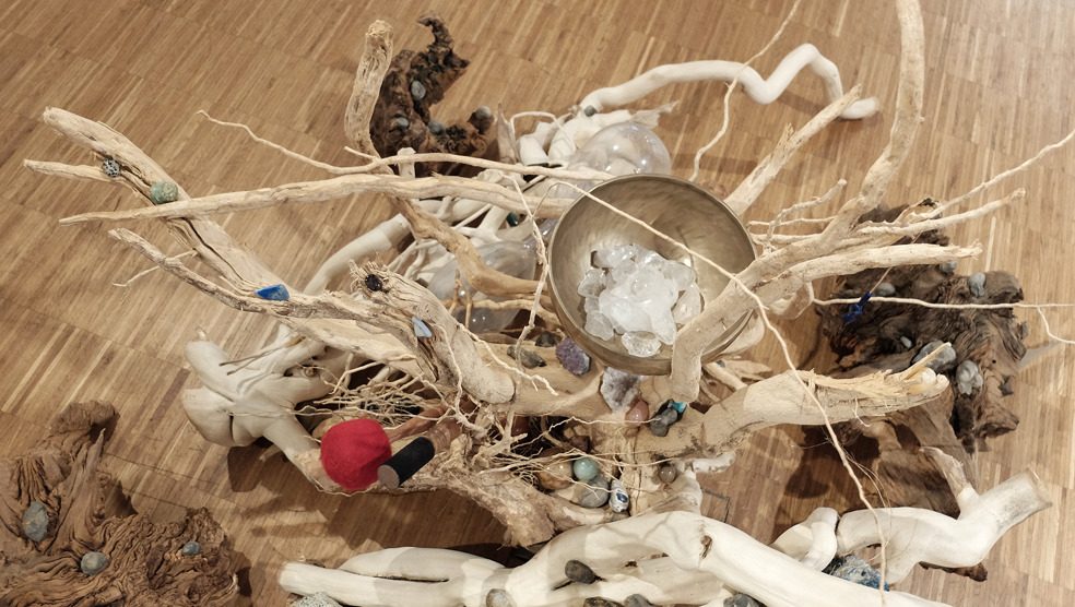 3 Eichenwurzeln, 2 Efeuwurzeln, 1 Eibischwurzel, Befreite Fossilschnecken, Wasserwirbler, Vollmondklangschale und 2 Klöppel, diverse Heilsteine.