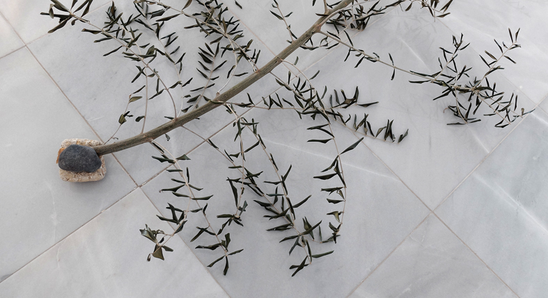 Vom angebunden Hund gerissener Olivenast. Olivenpresse aus 2 Steinen.