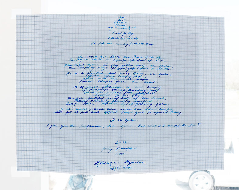 Umgedrehtes Tischgestell. Ausgediente Fenster. Handgebundenes Lederbuch. Stimmgabelanmutendes schweres Ding auf angeschwemmtem Lattenstück. Gefallene Engelstrompeten. Hölderlins Hyperion mit Bouquet aus Wildbrombeeren.