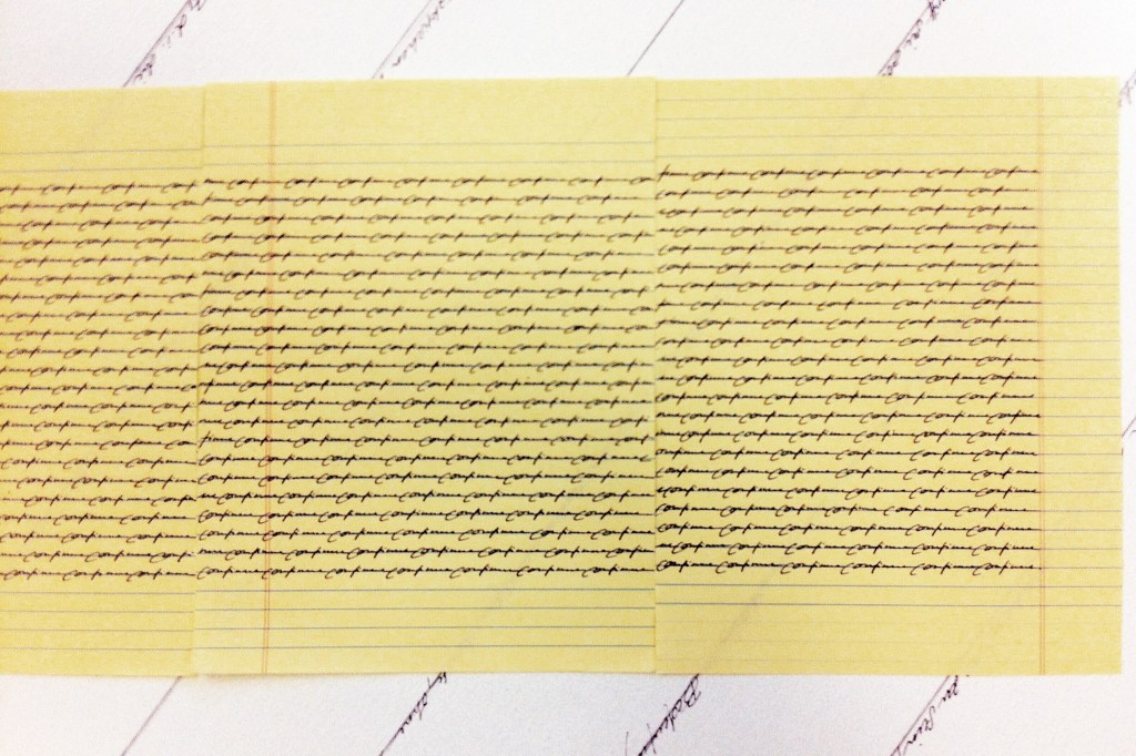 Tinte auf gelbem Notizpapier in Dokumentenhüllen. Umwandlung von Wut in Gleichgültigkeit. Zeit und Dimension variabel.