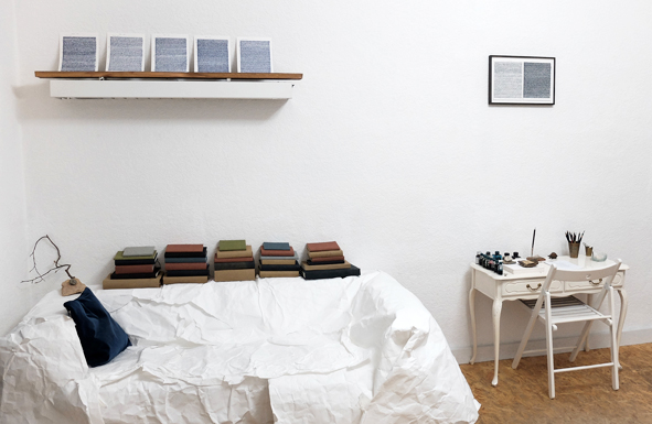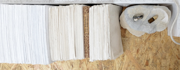 Handgerissene gedankengefüllte Papiere mit eingeschlossenen Büchern (hier: Die Schönheit), Steine, Wassertransportfläschchen, Arbeitstisch