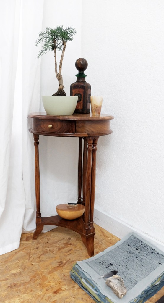 Geretteter Zimmerbonsai, der nun frei wachsen darf, Kalimba, Briefe an das Meer und Utensilien zur Wasserstrukturierung, Die Versammlung der Staatenlosen Steine tanzt eine Spirale um die Drei-Wurzel, die den Wasserwirbler trägt und auf Stein-wie Wasser thront,…