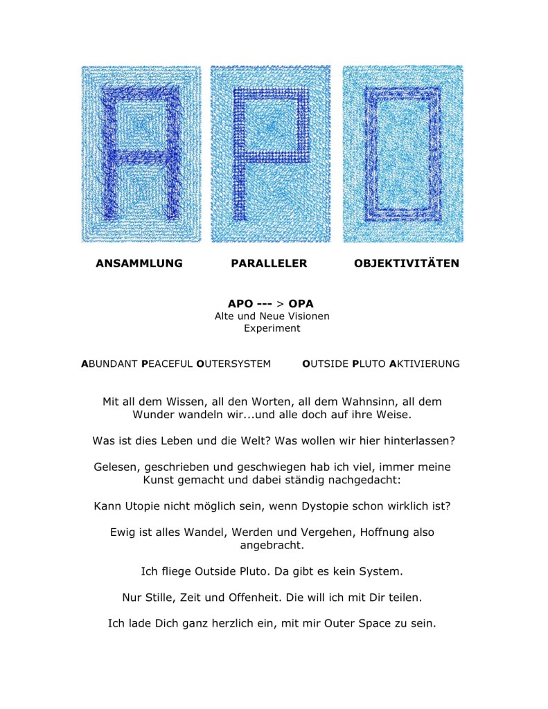Man stelle sich vor, eine Einzelne begäbe sich aus dieser Schattenwelt in ein unabhängiges friedliches Außersystem, in ein Experiment, in dem sie sich auf unbestimmte Zeit vom gegenwärtigen Weltgeschehen abwendet und lädt Mitmenschen ein, Raum und Zeit von nun an mit alten und neuen Visionen und Ritualen zu beleben.